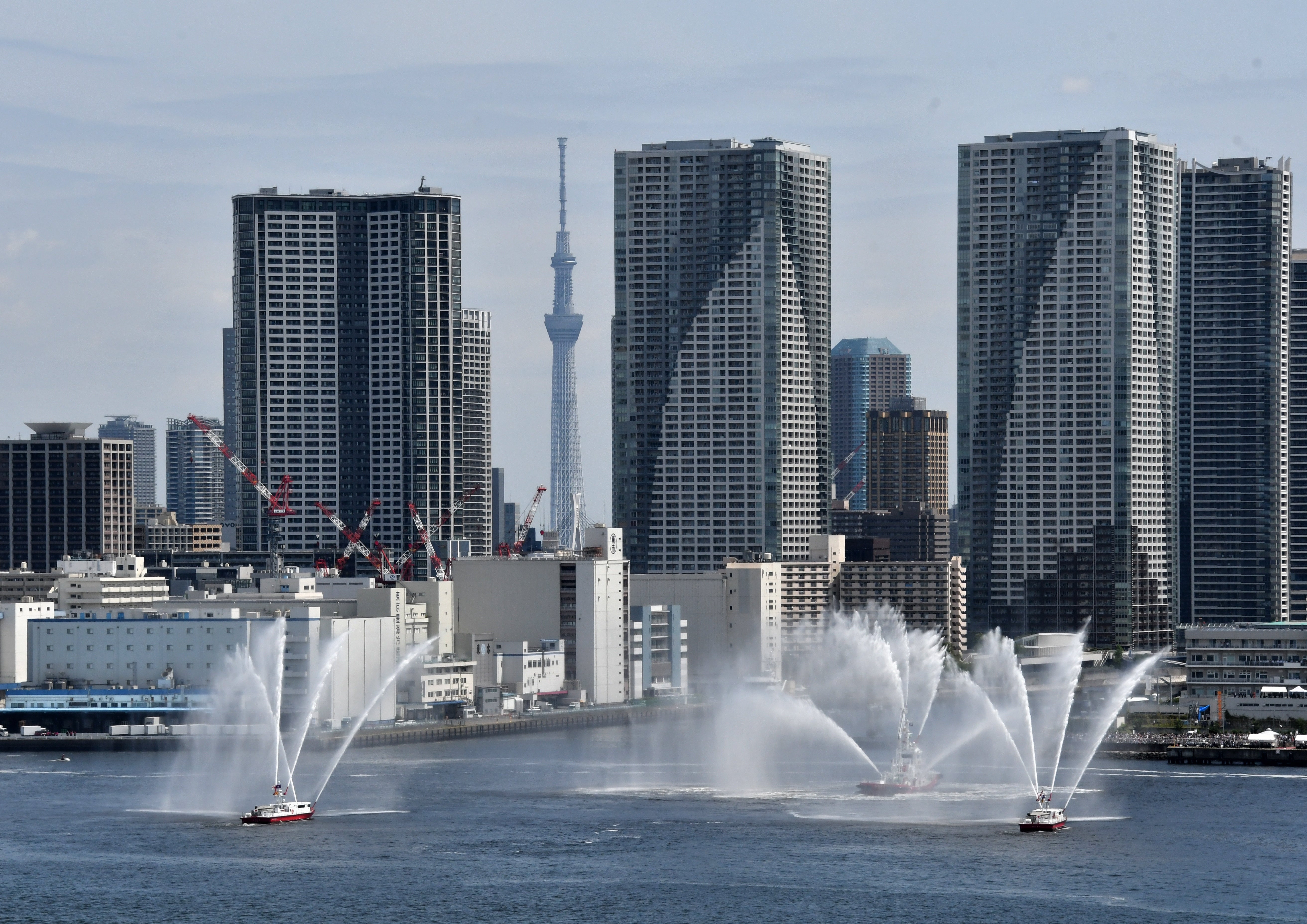 高層建築的直線構成和消防艇放水曲線的對比讓人心情舒暢,明暗對比也根據適度的對比構成了整齊的畫面。天空樹的口音效果也是準確的。