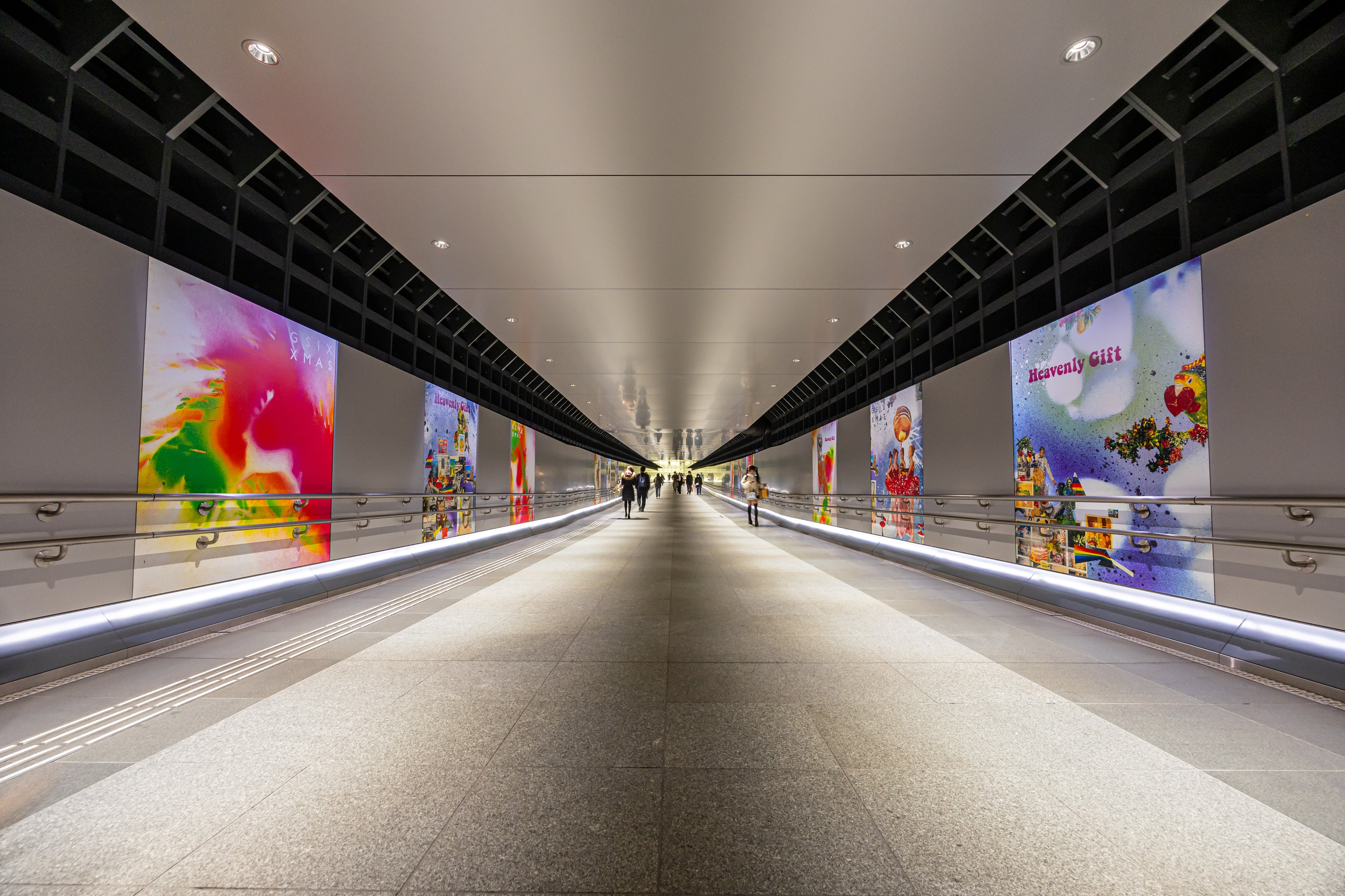 由直線構成的地下道通過強調廣角鏡頭遠近感的描寫和左右對稱的畫面構成,可以感受到寬廣和寂靜。中景的人物的配置和畫面上的大小是恰當的,也成為重音,收緊畫面。左右大窗口的色彩對比取得了平衡,帶來了愉快的回響。